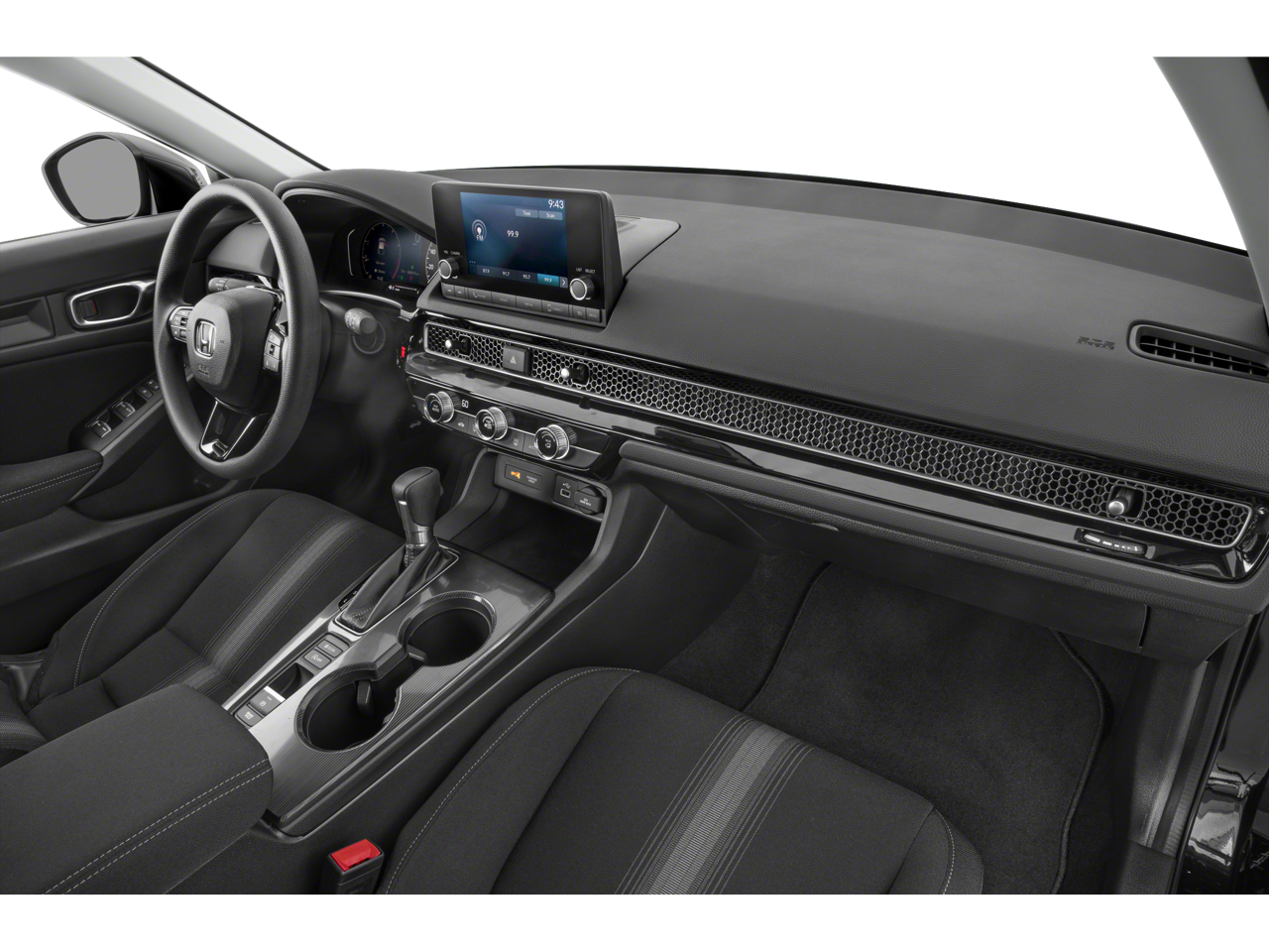 Step inside a cockpit designed to minimize distractions and maximize comfort. The interior features a stunning honeycomb mesh dash accent that elegantly hides the air vents, creating a clean, high-end feel.